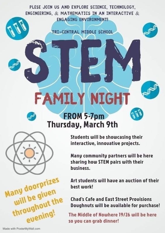 Tri-Central Community Schools is very excited that the Elementary and Middle School will be inviting families to explore both STEM programs. Please join us for what is sure to be a fun learning experience for all Thursday, March 9th from 5-7p.m.